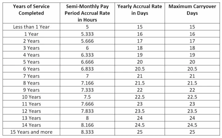 The amount of PTO each employee accrues depends on the length of service with AC, as indicated in the table below. The following schedule shows the PTO hours earned in each pay period for employees who work 40 hours a week: